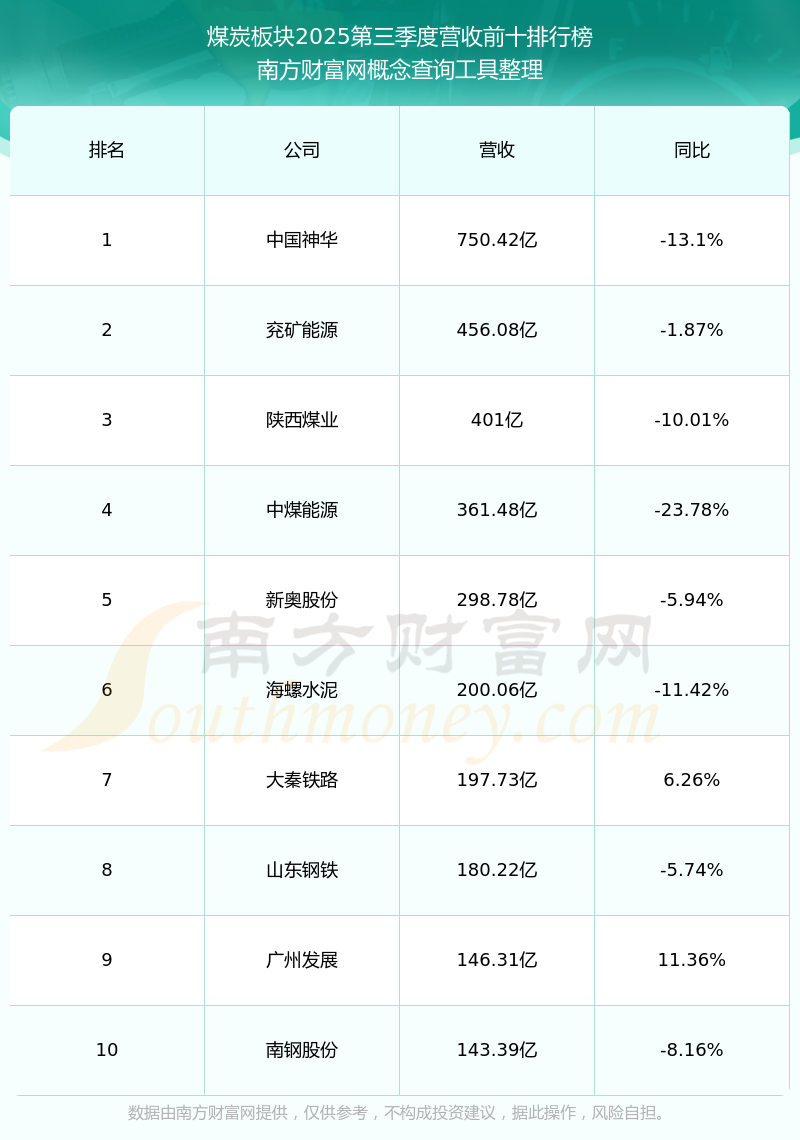 按照南方财富网概念查询工具统计,该股所属板块为煤炭板块,该板块共有72只股票,华阳股份2025第三季度营收在该板块中排名为第28名,该板块2025第三季度营收排名前十的股票如下表:
