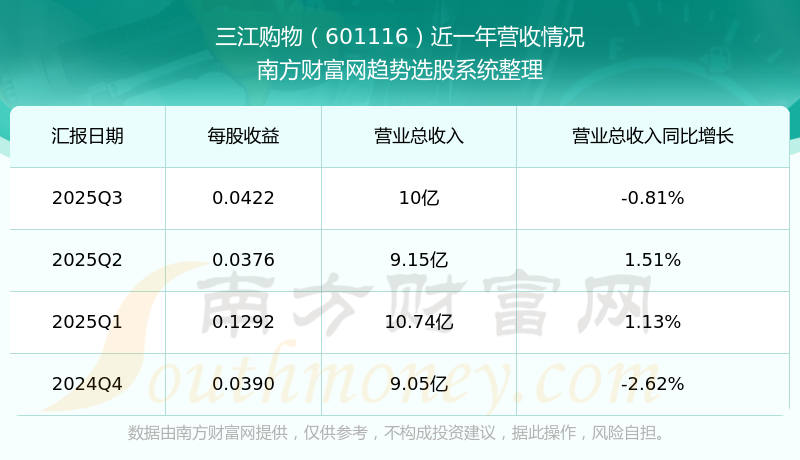 在2025年第三季度,三江购物的业绩表现,主营业务收入达到10亿元,实现了-0.81%的同比增长率。同时,公司归母净利润录得2312.08万元,同比增长-46.64%。