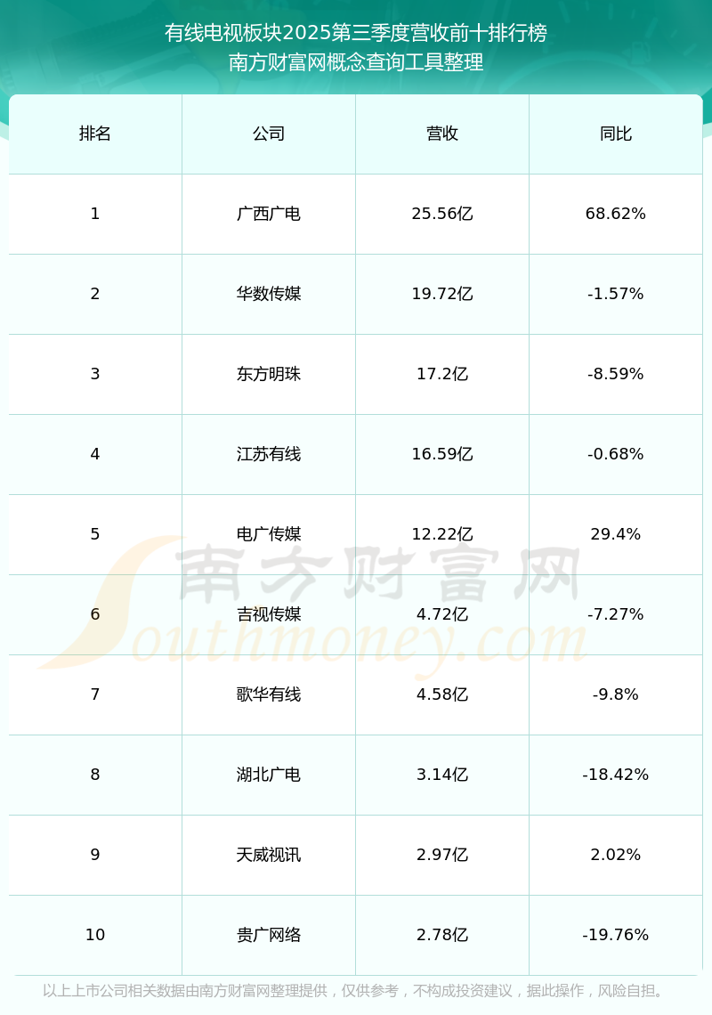 按照南方财富网概念查询工具统计,该股所属板块为有线电视板块,该板块共有15只股票,歌华有线2025第三季度营收在该板块中排名为第7名,该板块2025第三季度营收排名前十的股票如下表:
