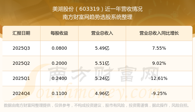 美湖股份2025年第三季度财报显示,公司主营收入5.49亿元,同比7.55%;归母净利润2750.16万元,同比-47.38%;扣非净利润2692.19万元,同比-45.97%。