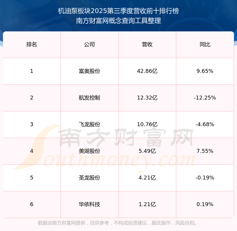 按照南方财富网概念查询工具统计,该股所属板块为机油泵板块,该板块共有6只股票,美湖股份2025第三季度营收在该板块中排名为第4名,该板块2025第三季度营收排名前十的股票如下表: