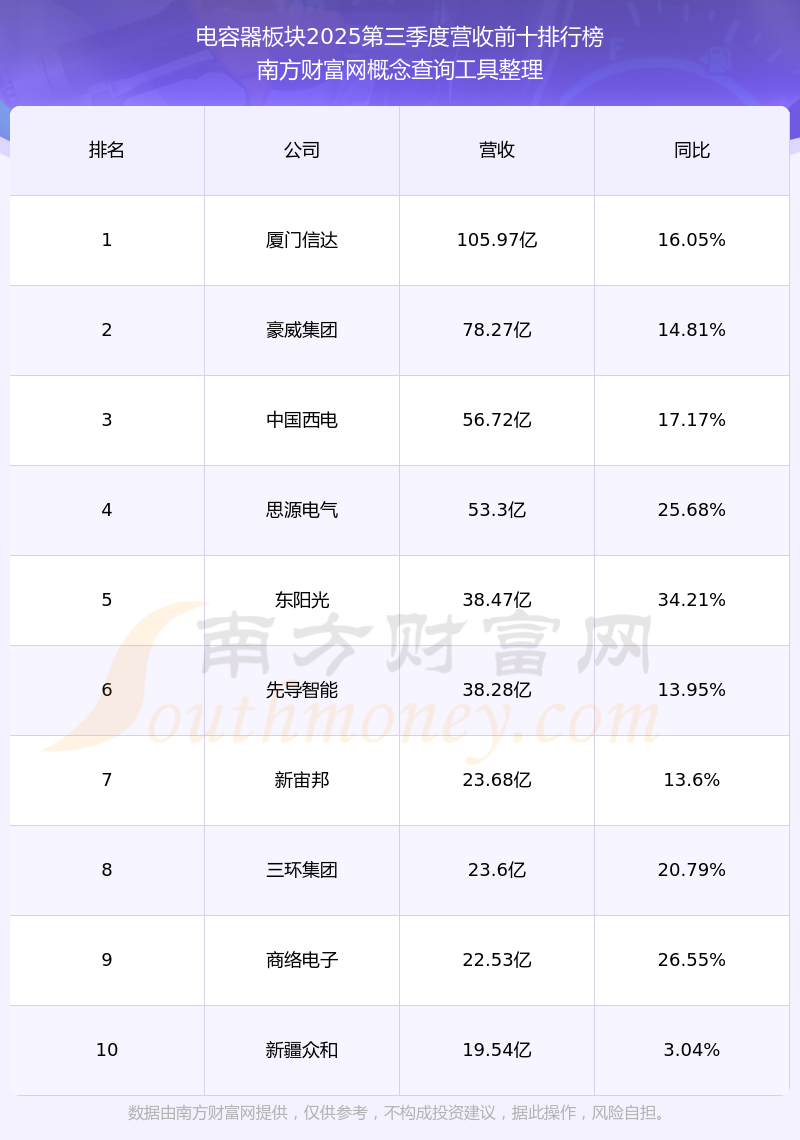按照南方财富网概念查询工具统计,该股所属板块为电容器板块,该板块共有40只股票,铜峰电子2025第三季度营收在该板块中排名为第29名,该板块2025第三季度营收排名前十的股票如下表: