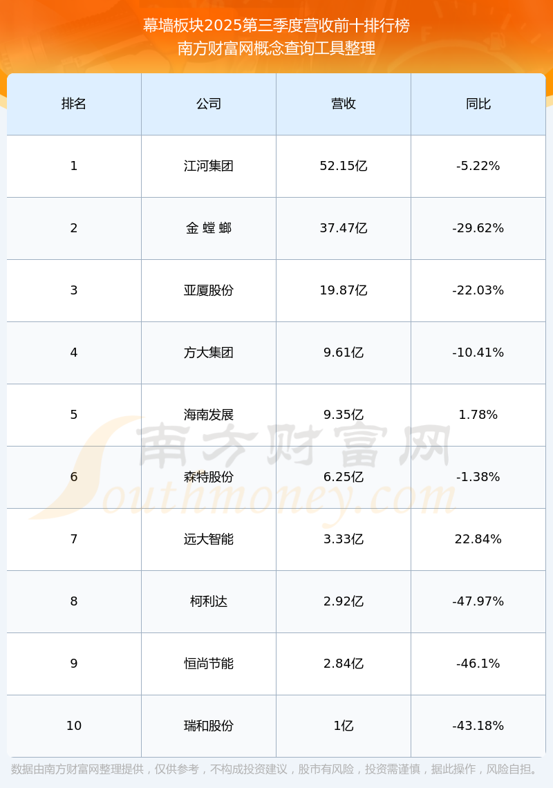 按照南方财富网概念查询工具统计,该股所属板块为幕墙板块,该板块共有11只股票,恒尚节能2025第三季度营收在该板块中排名为第9名,该板块2025第三季度营收排名前十的股票如下表: