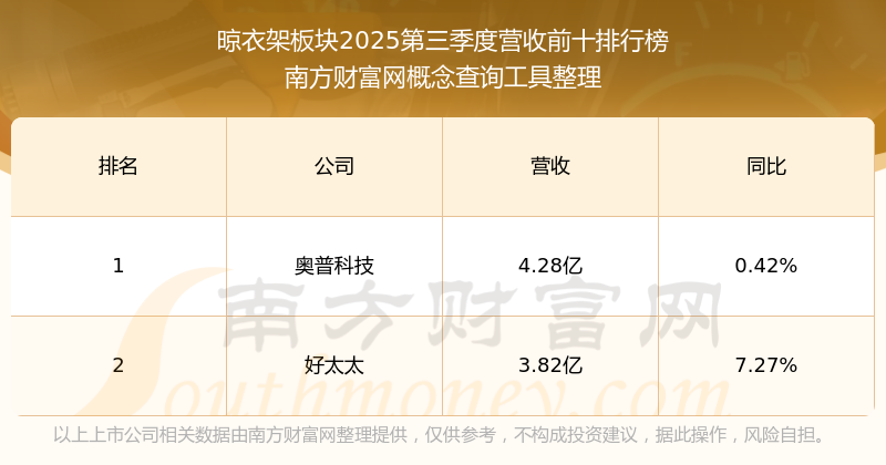 按照南方财富网概念查询工具统计,该股所属板块为晾衣架板块,该板块共有2只股票,好太太2025第三季度营收在该板块中排名为第2名,该板块2025第三季度营收排名前十的股票如下表: