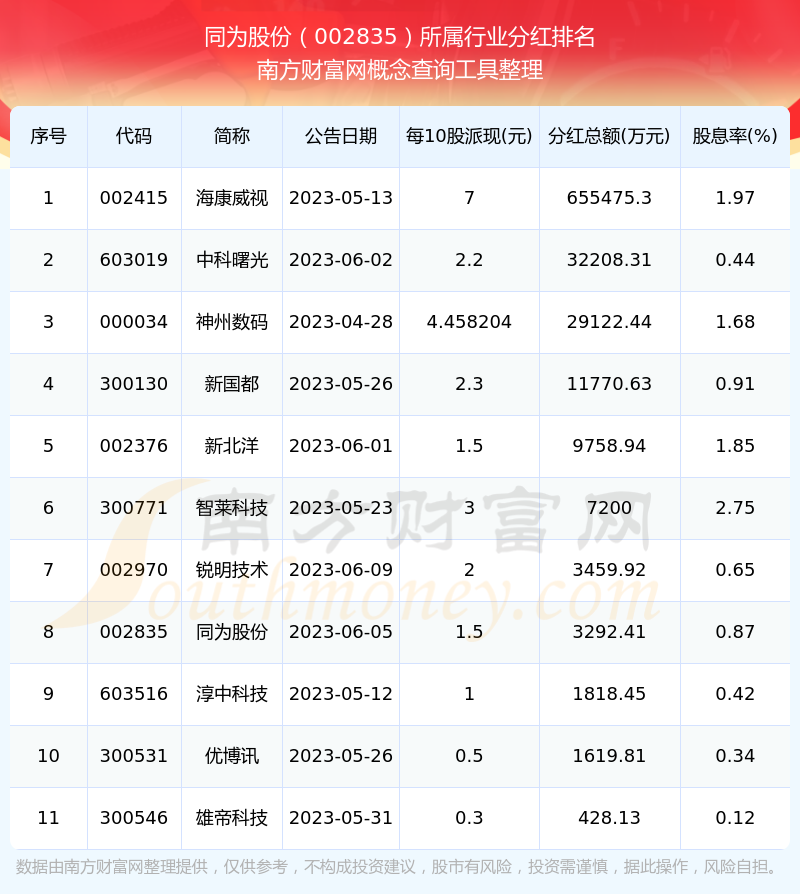 按照南方财富网趋势选股系统统计,同为股份所属行业为视频监控行业,视频监控行业分红排名情况如下表: