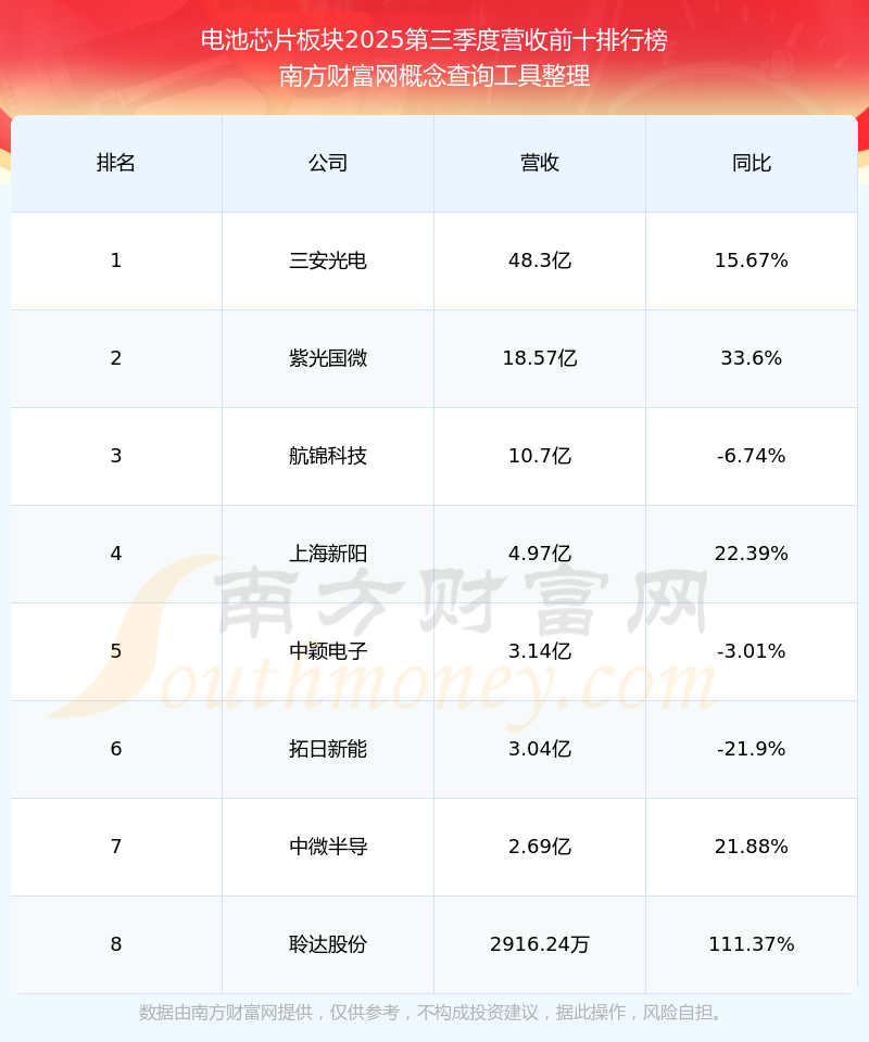 按照南方财富网概念查询工具统计,该股所属板块为电池芯片板块,该板块共有8只股票,赛微微电2025第三季度营收在该板块中排名为第8名,该板块2025第三季度营收排名前十的股票如下表: