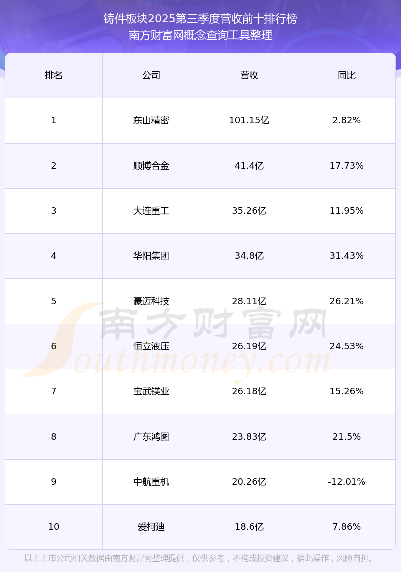 按照南方财富网概念查询工具统计,该股所属板块为铸件板块,该板块共有37只股票,日月股份2025第三季度营收在该板块中排名为第13名,该板块2025第三季度营收排名前十的股票如下表: