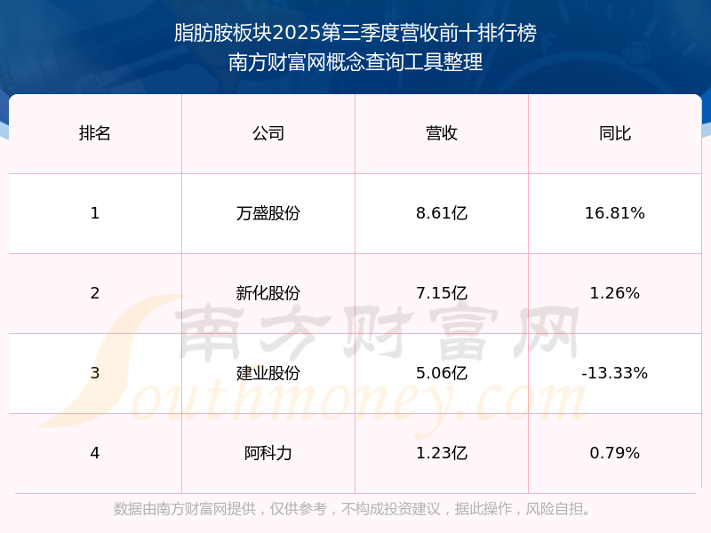 按照南方财富网概念查询工具统计,该股所属板块为脂肪胺板块,该板块共有4只股票,建业股份2025第三季度营收在该板块中排名为第3名,该板块2025第三季度营收排名前十的股票如下表: