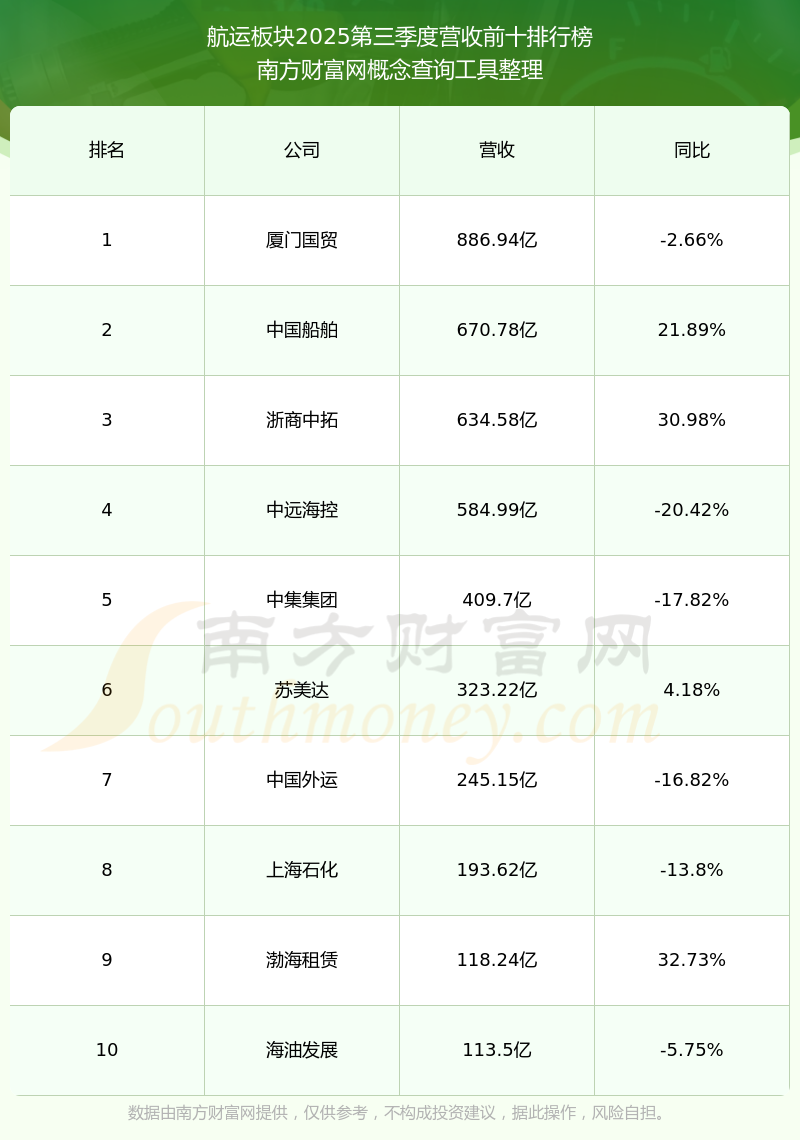 按照南方财富网概念查询工具统计,该股所属板块为航运板块,该板块共有89只股票,宁波远洋2025第三季度营收在该板块中排名为第46名,该板块2025第三季度营收排名前十的股票如下表: