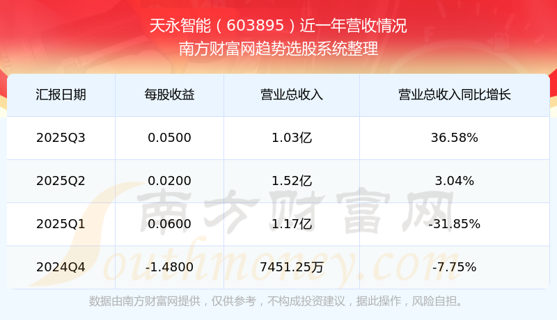 天永智能(603895)披露2025年第三季度报告,报告期实现营收1.03亿元,同比36.58%;归母净利润303.76万元,同比112.53%;扣非净利润224.45万元,同比119.81%;基本每股收益0.05元。