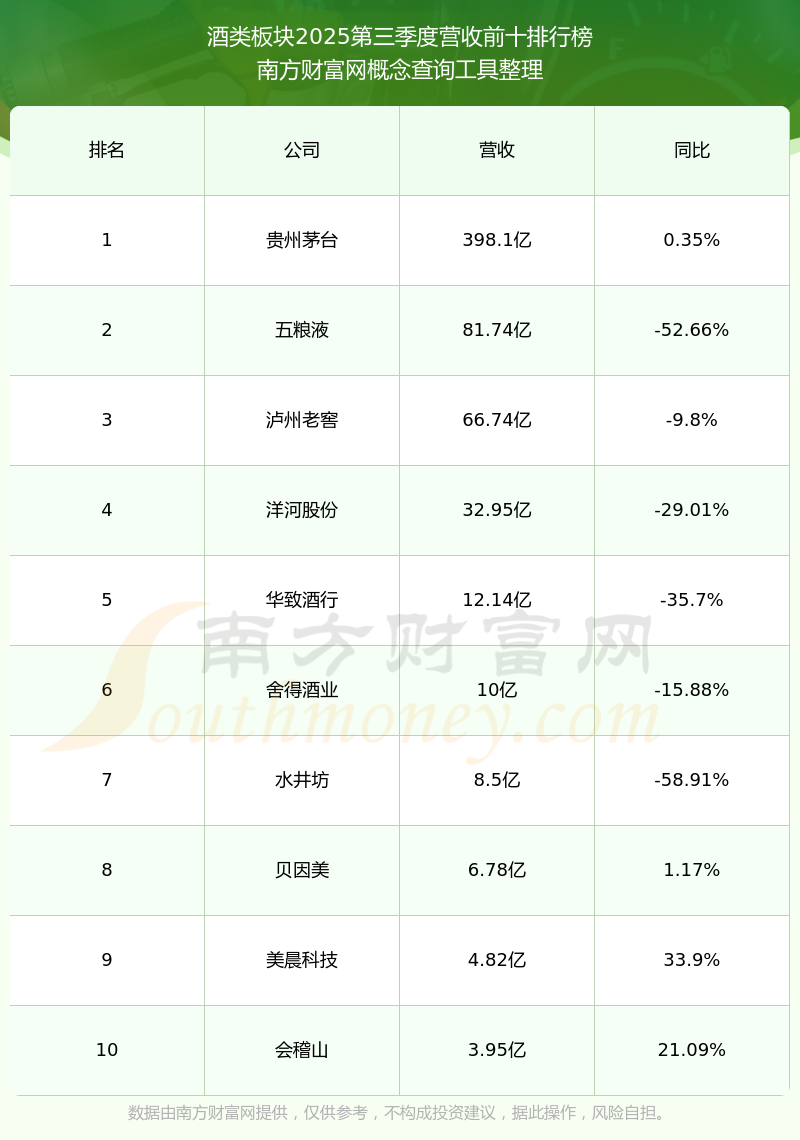 按照南方财富网概念查询工具统计,该股所属板块为酒类板块,该板块共有17只股票,舍得酒业2025第三季度营收在该板块中排名为第6名,该板块2025第三季度营收排名前十的股票如下表: