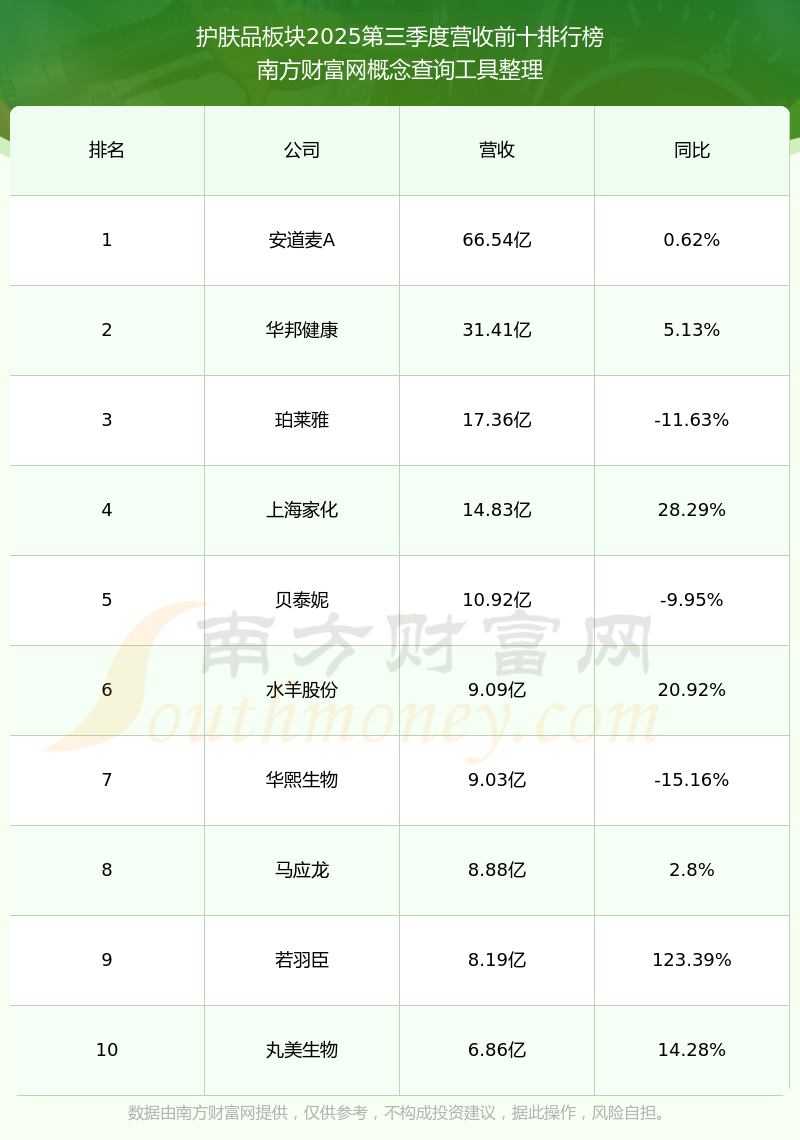 按照南方财富网概念查询工具统计,该股所属板块为护肤品板块,该板块共有26只股票,丽人丽妆2025第三季度营收在该板块中排名为第20名,该板块2025第三季度营收排名前十的股票如下表:
