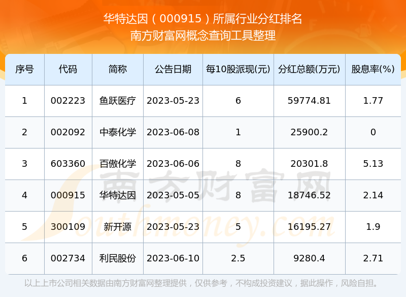 按照南方财富网趋势选股系统统计,华特达因所属行业为化学制药行业,化学制药行业分红排名情况如下表:
