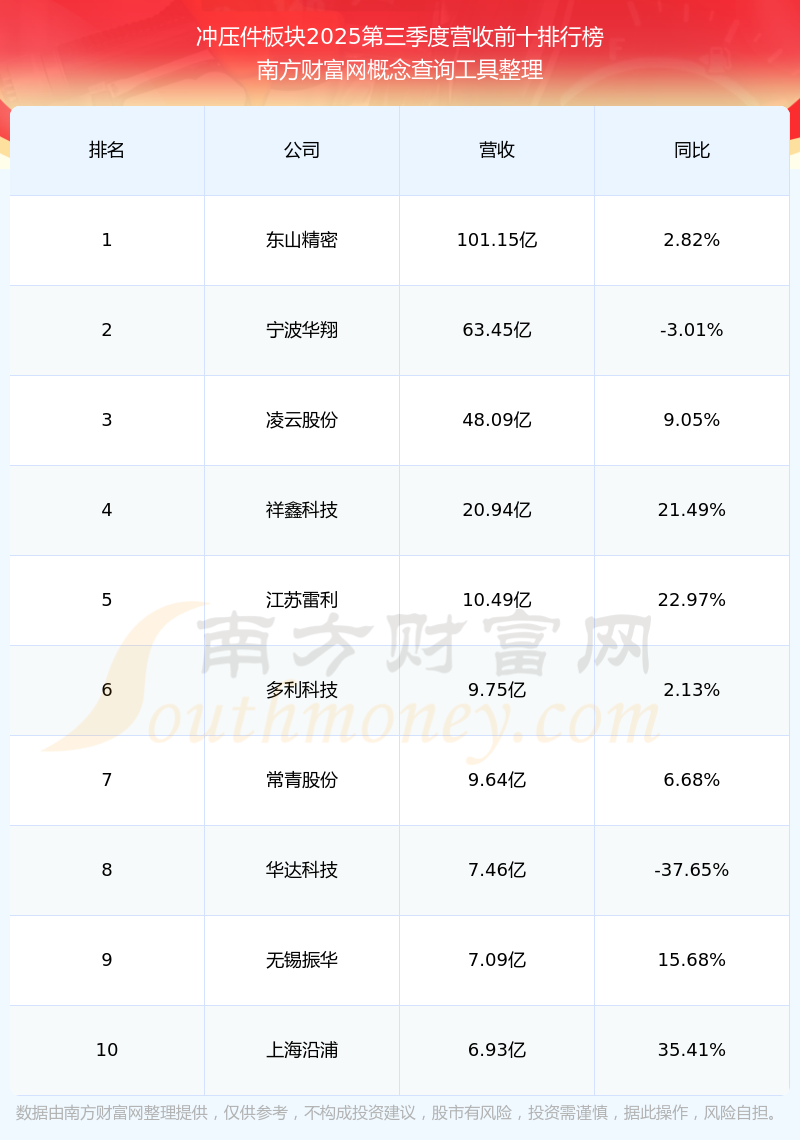按照南方财富网概念查询工具统计,该股所属板块为冲压件板块,该板块共有14只股票,浙江黎明2025第三季度营收在该板块中排名为第14名,该板块2025第三季度营收排名前十的股票如下表: