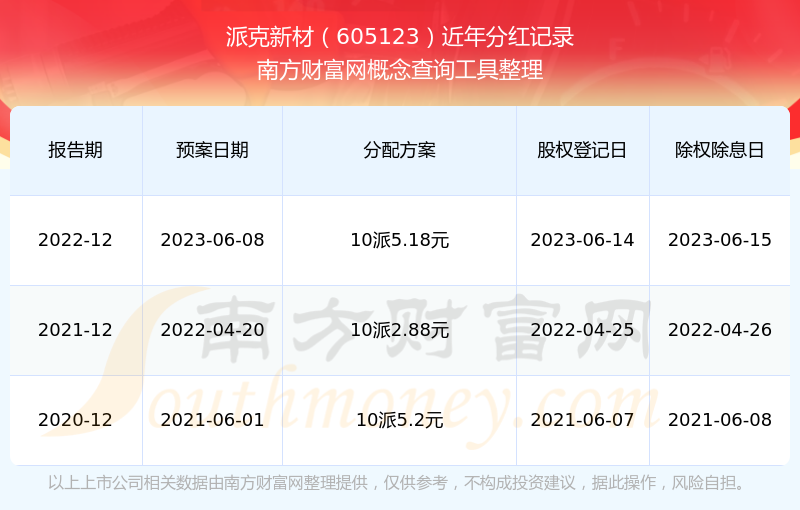 派克新材最新一次公布的分红方案为10派5.18元。本次权益分派股权登记日为2023年6月14日,除权除息日为2023年6月15日,派息日为2023年6月15日。