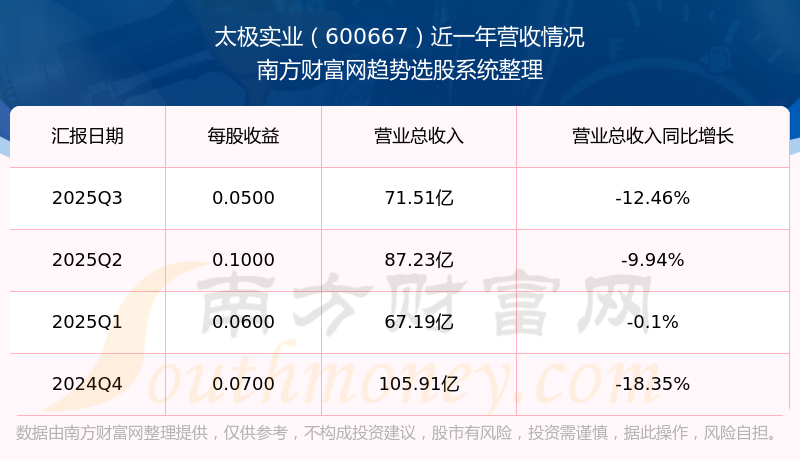 太极实业(600667)披露2025年第三季度报告,报告期实现营收71.51亿元,同比-12.46%;归母净利润1.15亿元,同比-15.19%;扣非净利润1.04亿元,同比-22.47%;基本每股收益0.05元。