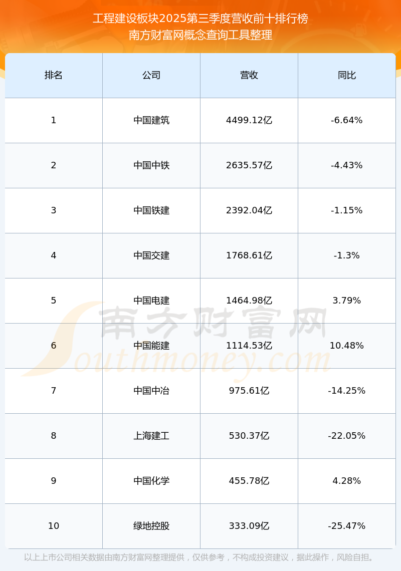 按照南方财富网概念查询工具统计,该股所属板块为工程建设板块,该板块共有139只股票,太极实业2025第三季度营收在该板块中排名为第139名,该板块2025第三季度营收排名前十的股票如下表: