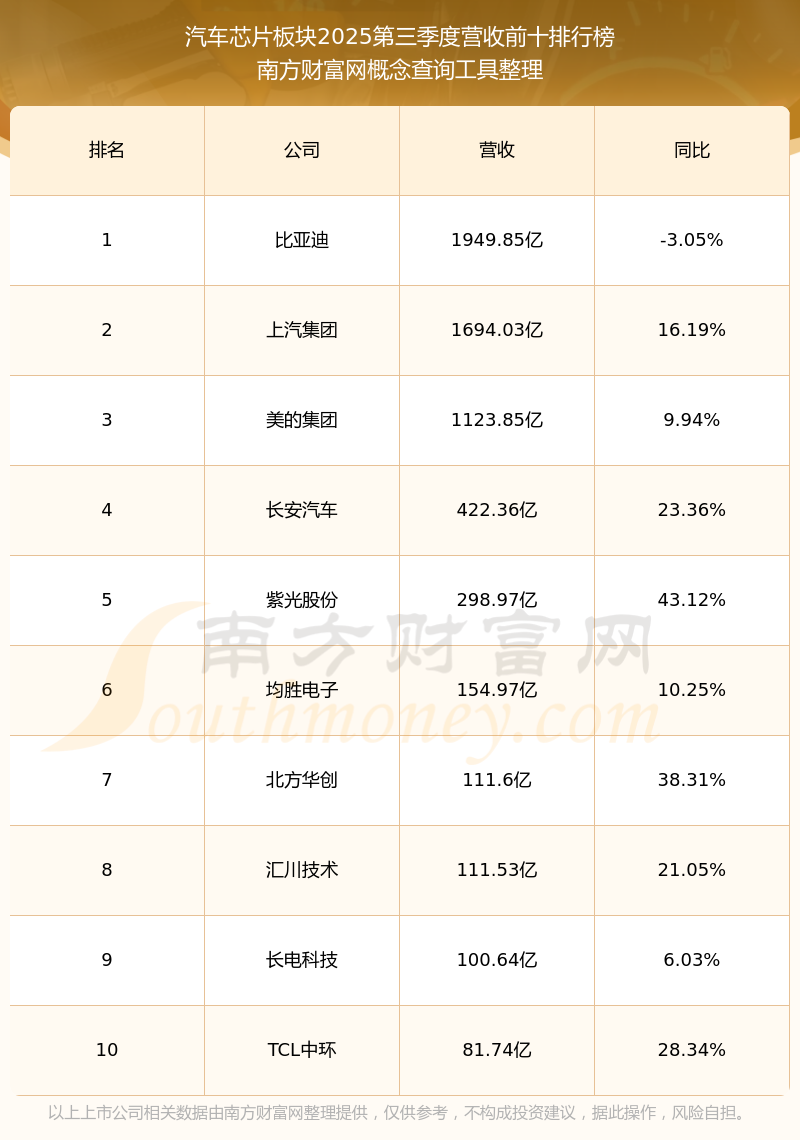 按照南方财富网概念查询工具统计,该股所属板块为汽车芯片板块,该板块共有212只股票,豪威集团2025第三季度营收在该板块中排名为第11名,该板块2025第三季度营收排名前十的股票如下表: