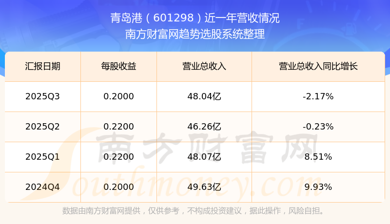青岛港2025年第三季度报告显示,公司实现主营业务收入48.04亿元,较去年同期增长-2.17%;归属于母公司股东的净利润为13.39亿元,同比增长3.79%;扣除非经常性损益后的净利润为12.98亿元,同比增长0.28%。