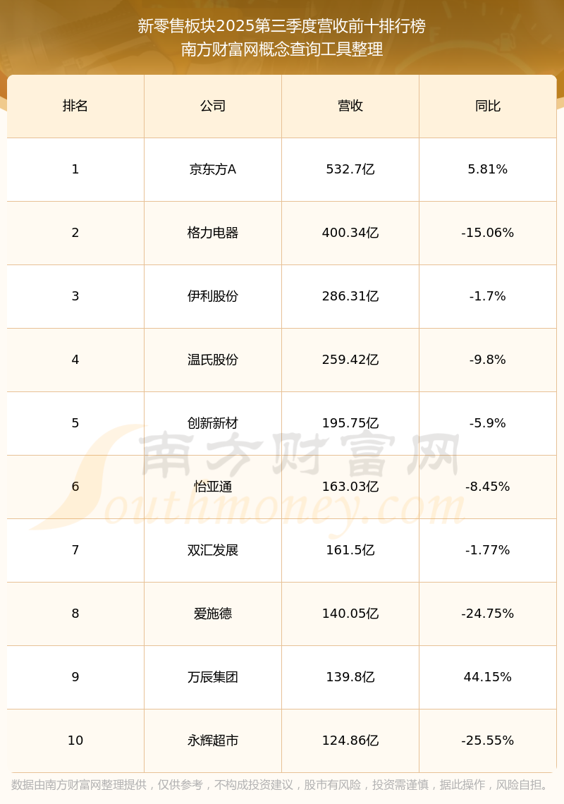 按照南方财富网概念查询工具统计,该股所属板块为新零售板块,该板块共有207只股票,豫园股份2025第三季度营收在该板块中排名为第14名,该板块2025第三季度营收排名前十的股票如下表: