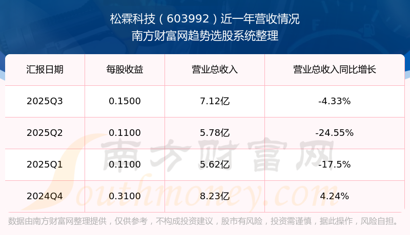 松霖科技(603992)发布2025年第三季度财报。2025年第三季度松霖科技实现营业收入7.12亿元,同比增加-4.33元%,环比增加23.12%;净利润为6556.43万元,同比增长-34.1%,环比增长37.65%。