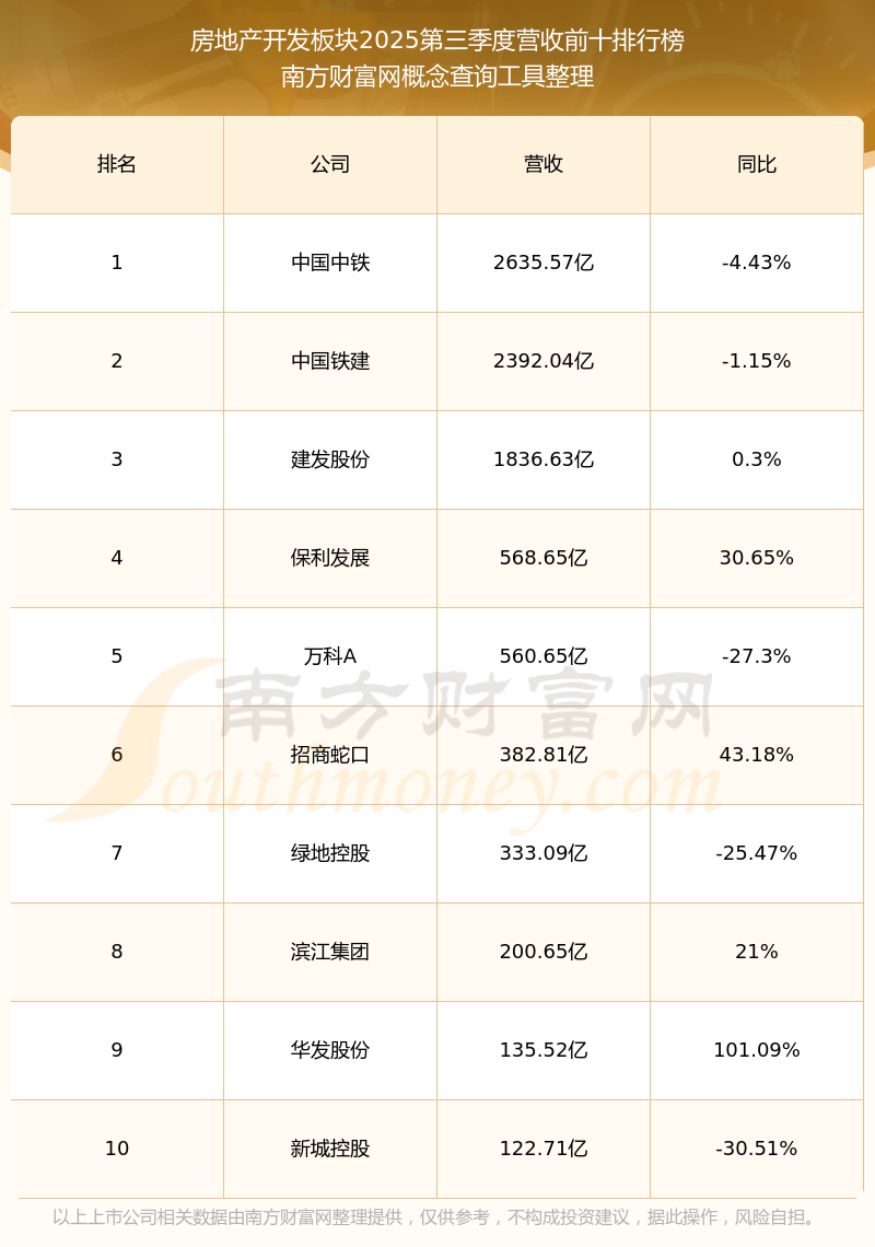 按照南方财富网概念查询工具统计,该股所属板块为房地产开发板块,该板块共有142只股票,天地源2025第三季度营收在该板块中排名为第81名,该板块2025第三季度营收排名前十的股票如下表: