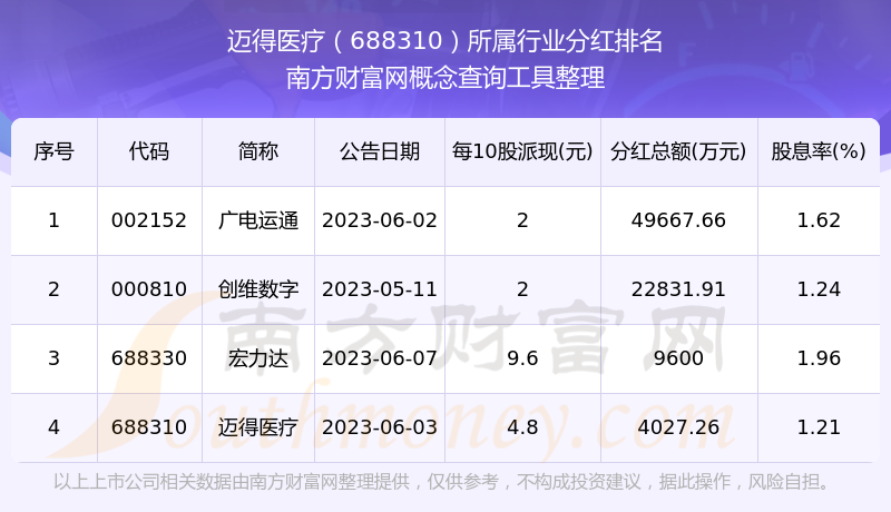 按照南方财富网趋势选股系统统计,迈得医疗所属行业为医用耗材行业,医用耗材行业分红排名情况如下表: