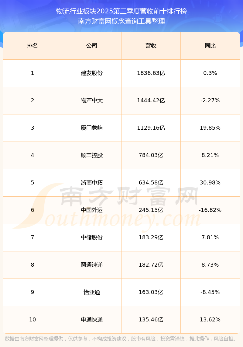 按照南方财富网概念查询工具统计,该股所属板块为物流行业板块,该板块共有57只股票,瑞茂通2025第三季度营收在该板块中排名为第16名,该板块2025第三季度营收排名前十的股票如下表: