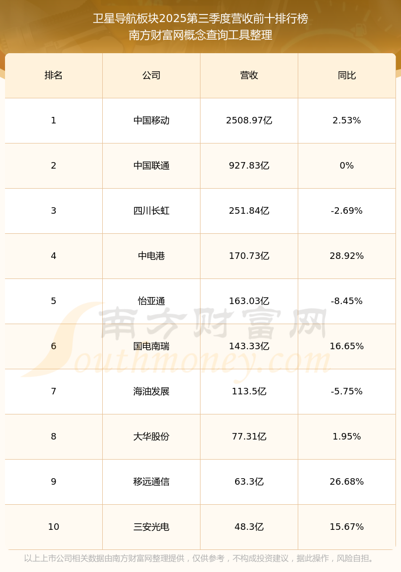 按照南方财富网概念查询工具统计,该股所属板块为卫星导航板块,该板块共有221只股票,司南导航2025第三季度营收在该板块中排名为第199名,该板块2025第三季度营收排名前十的股票如下表: