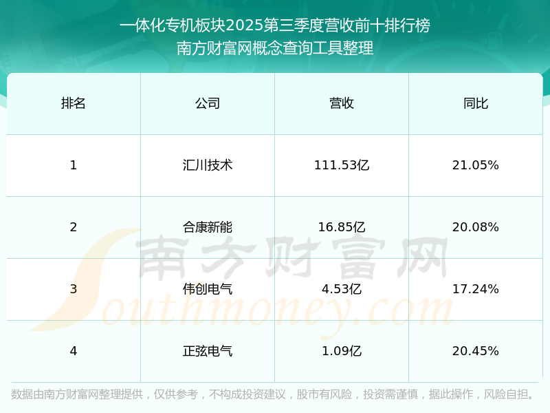 按照南方财富网概念查询工具统计,该股所属板块为一体化专机板块,该板块共有4只股票,正弦电气2025第三季度营收在该板块中排名为第4名,该板块2025第三季度营收排名前十的股票如下表: