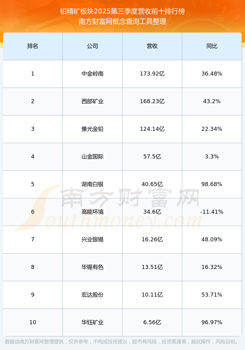 按照南方财富网概念查询工具统计,该股所属板块为铅精矿板块,该板块共有14只股票,金徽股份2025第三季度营收在该板块中排名为第14名,该板块2025第三季度营收排名前十的股票如下表: