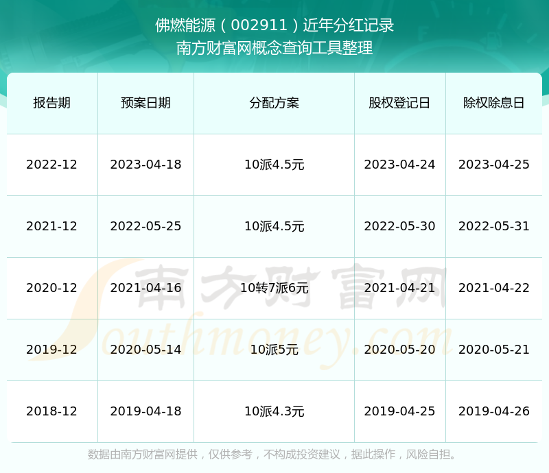 佛燃能源最新一次公布的分红方案为10派4.5元。本次权益分派股权登记日为2023年4月24日,除权除息日为2023年4月25日,派息日为2023年4月25日。