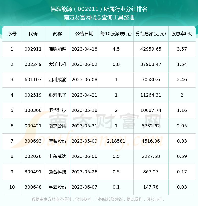 按照南方财富网趋势选股系统统计,佛燃能源所属行业为天然气行业,天然气行业分红排名情况如下表: