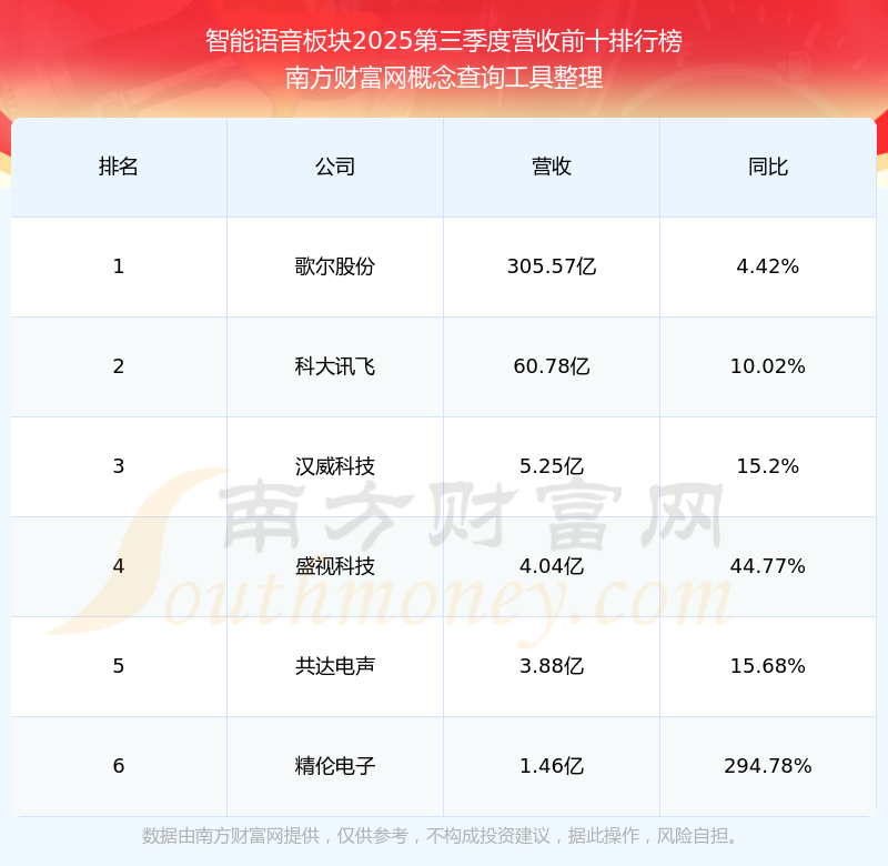 按照南方财富网概念查询工具统计,该股所属板块为智能语音板块,该板块共有6只股票,海天瑞声2025第三季度营收在该板块中排名为第6名,该板块2025第三季度营收排名前十的股票如下表: