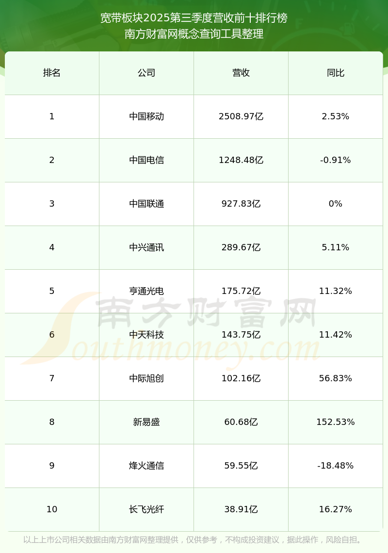 按照南方财富网概念查询工具统计,该股所属板块为宽带板块,该板块共有19只股票,中国移动2025第三季度营收在该板块中排名为第1名,该板块2025第三季度营收排名前十的股票如下表: