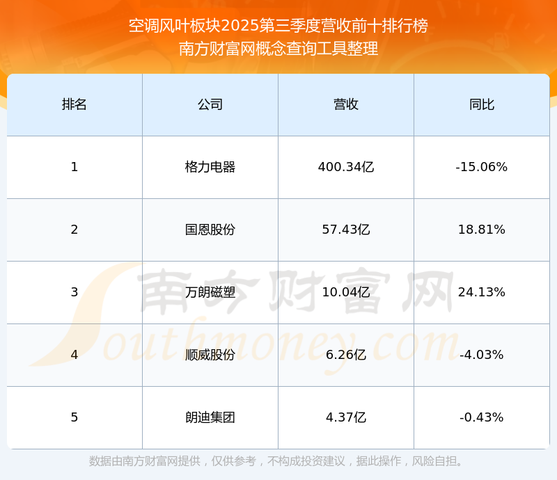 按照南方财富网概念查询工具统计,该股所属板块为空调风叶板块,该板块共有5只股票,朗迪集团2025第三季度营收在该板块中排名为第5名,该板块2025第三季度营收排名前十的股票如下表: