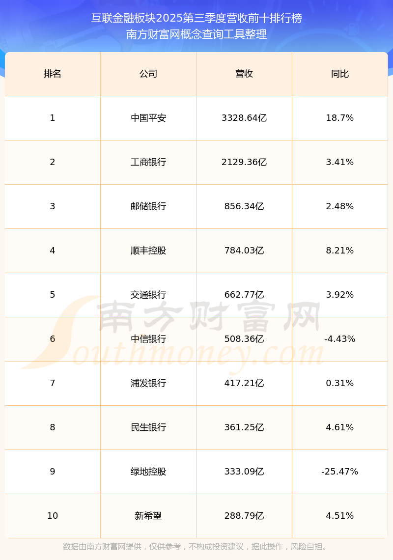 按照南方财富网概念查询工具统计,该股所属板块为互联金融板块,该板块共有238只股票,南京证券2025第三季度营收在该板块中排名为第238名,该板块2025第三季度营收排名前十的股票如下表: