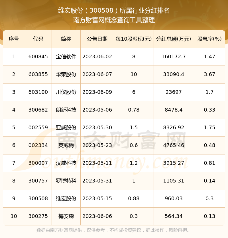 按照南方财富网趋势选股系统统计,维宏股份所属行业为一体机行业,一体机行业分红排名情况如下表: