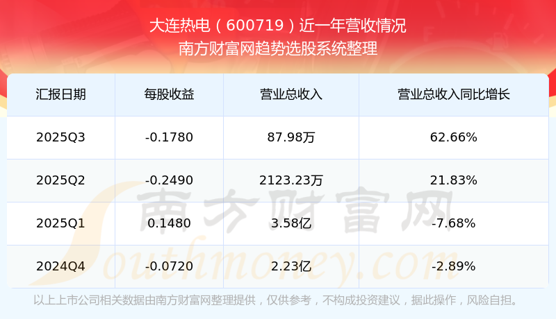 在2025年第三季度,大连热电的业绩表现,主营业务收入达到87.98万元,实现了62.66%的同比增长率。同时,公司归母净利润录得-7188.33万元,同比增长4.19%。