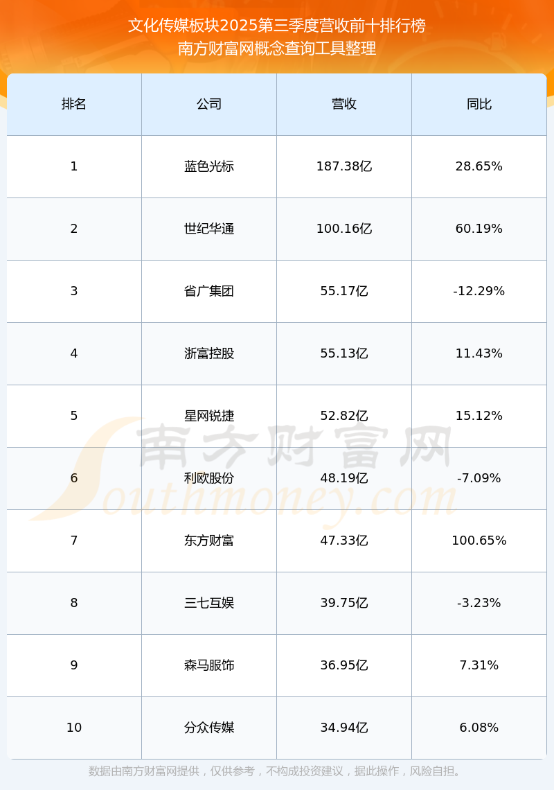 按照南方财富网概念查询工具统计,该股所属板块为文化传媒板块,该板块共有240只股票,中国科传2025第三季度营收在该板块中排名为第79名,该板块2025第三季度营收排名前十的股票如下表: