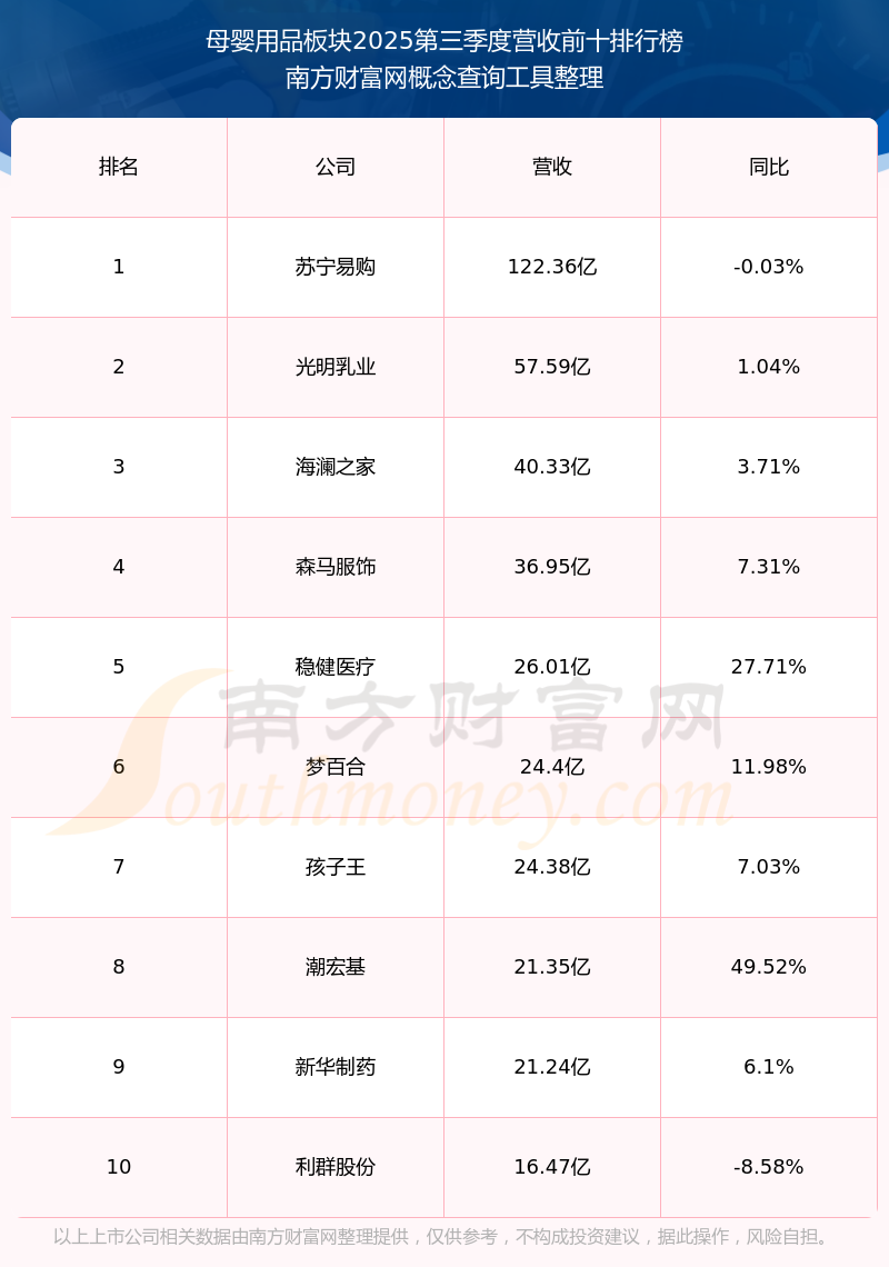按照南方财富网概念查询工具统计,该股所属板块为母婴用品板块,该板块共有32只股票,润本股份2025第三季度营收在该板块中排名为第32名,该板块2025第三季度营收排名前十的股票如下表: