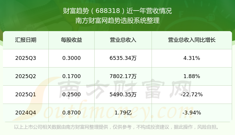 财富趋势发布2025年第三季度财报。实现总营收6535.34万元,同比增长4.31%;扣非净利润同比增长-3.77%至3060.47万元。