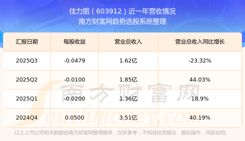 财报显示,2025年第三季度佳力图营收1.62亿元,同比增长-23.32%,净利润-2596.56万元,同比增长-2104.78%。