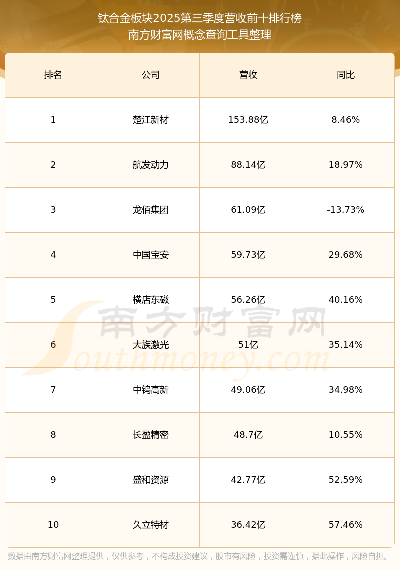 按照南方财富网概念查询工具统计,该股所属板块为钛合金板块,该板块共有52只股票,西部超导2025第三季度营收在该板块中排名为第20名,该板块2025第三季度营收排名前十的股票如下表: