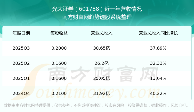 光大证券2025年第三季度显示,公司主营收入30.65亿元,同比37.89%;归母净利润9.95亿元,同比65.88%;扣非净利润9.99亿元,同比85.31%;