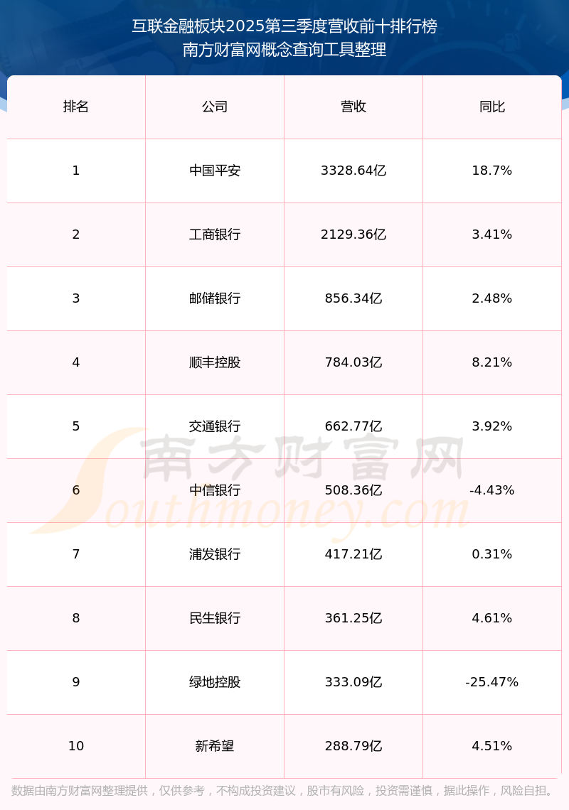 按照南方财富网概念查询工具统计,该股所属板块为互联金融板块,该板块共有238只股票,光大证券2025第三季度营收在该板块中排名为第56名,该板块2025第三季度营收排名前十的股票如下表: