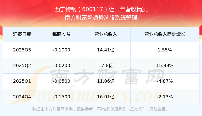 于2025年第三季度,西宁特钢披露了其业绩表现,其中主营业务收入14.41亿元,相较于去年同期1.55%。此外,公司归属于母公司的净利润为-3.27亿元,同比增长了-200.61%。在扣除所有非经常性损益后,净利润-3.22亿元,同比增长-56.21%。