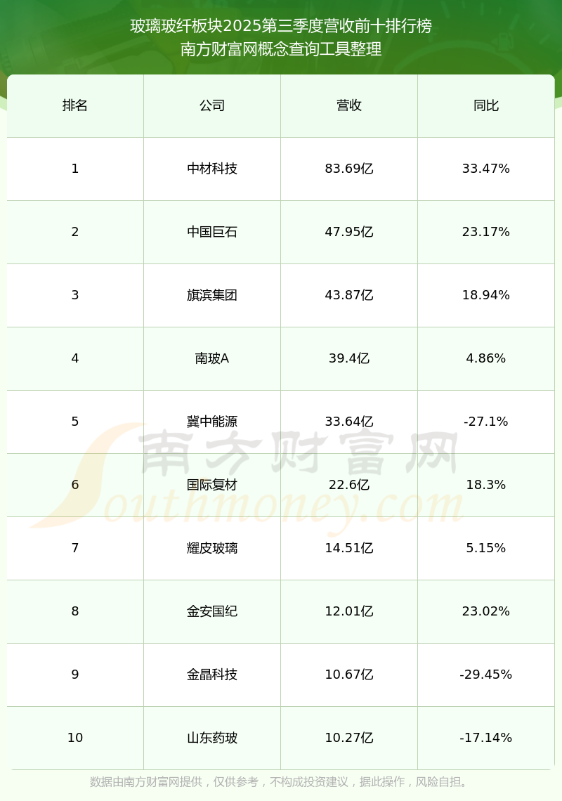 按照南方财富网概念查询工具统计,该股所属板块为玻璃玻纤板块,该板块共有23只股票,凯盛新能2025第三季度营收在该板块中排名为第11名,该板块2025第三季度营收排名前十的股票如下表: