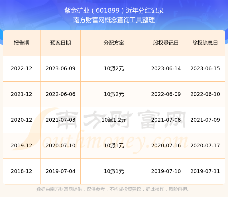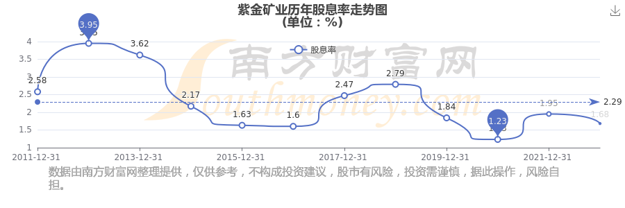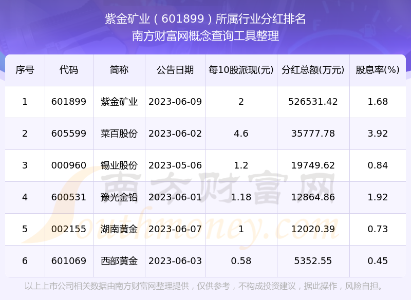 按照南方财富网趋势选股系统统计,紫金矿业所属行业为铜精矿行业,铜精矿行业分红排名情况如下表: