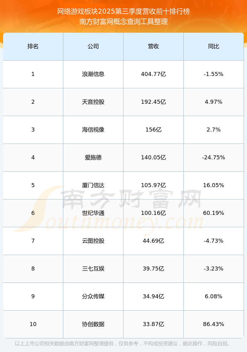 按照南方财富网概念查询工具统计,该股所属板块为网络游戏板块,该板块共有139只股票,文投控股2025第三季度营收在该板块中排名为第118名,该板块2025第三季度营收排名前十的股票如下表: